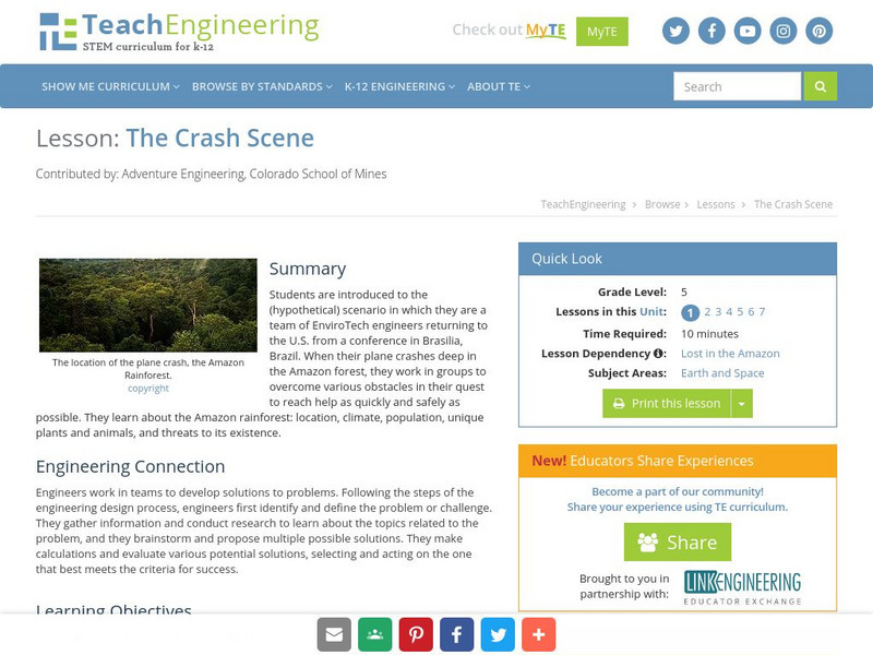 Fifth graders are introduced to the (hypothetical) scenario in which they are a team of EnviroTech engineers returning to the U.S. from a conference in Brasilia, Brazil. When their plane crashes deep in the Amazon forest, they work in groups to overcome various obstacles in their quest to reach help as quickly and safely as possible. They learn about the Amazon rainforest: location, climate, population, unique plants and animals, and threats to its existence.