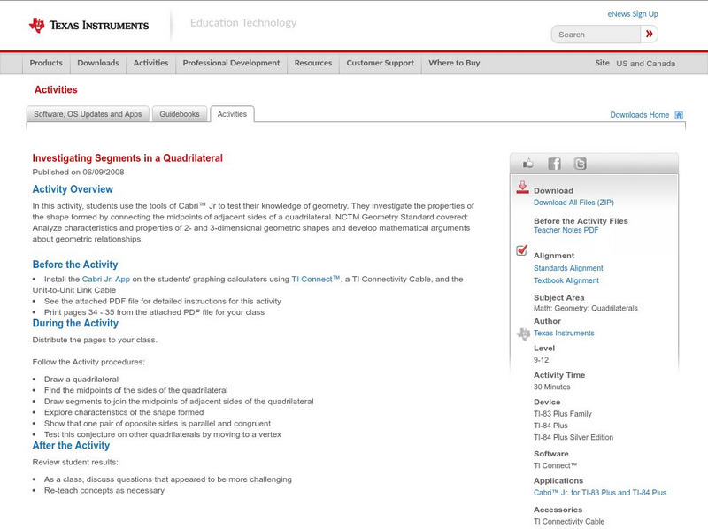 In this activity, students use the tools of Cabri Jr to test their knowledge of geometry. They investigate the properties of the shape formed by connecting the midpoints of adjacent sides of a quadrilateral.