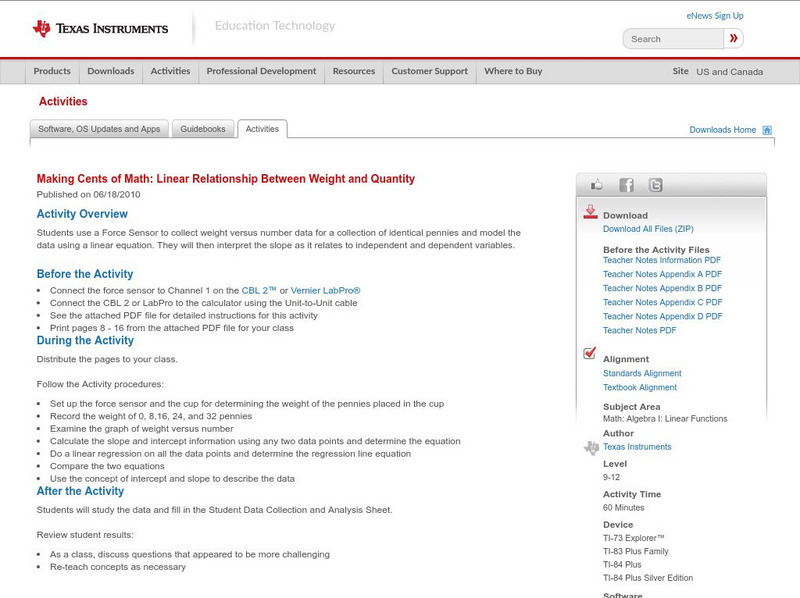 Students use a Force Sensor to collect weight versus number data for a collection of identical pennies and model the data using a linear equation. They will then interpret the slope as it relates to independent and dependent variables.