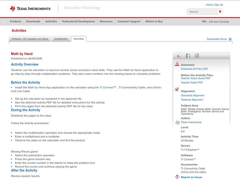 Students use the calculator to improve number sense and place value skills. They use the Math by Hand application to go step-by-step through multiplication problems. They also insert numbers into the missing places to complete problems.