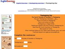 In this Thanksgiving worksheet, students fill in the blanks to sentences about Thanksgiving and label pictures. Students complete 2 activities.