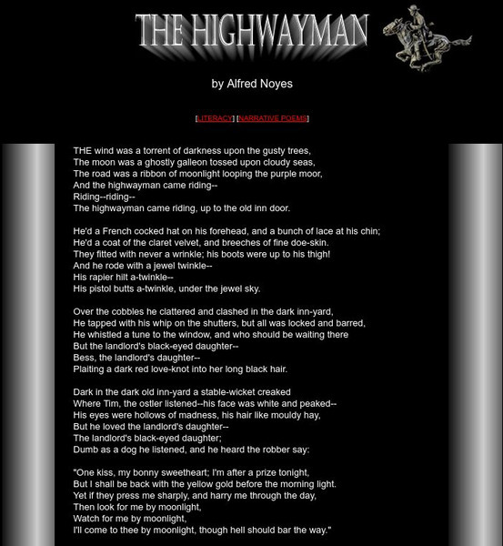A complete text of the narrative poem "The Highwayman" by Alfred Noyes.