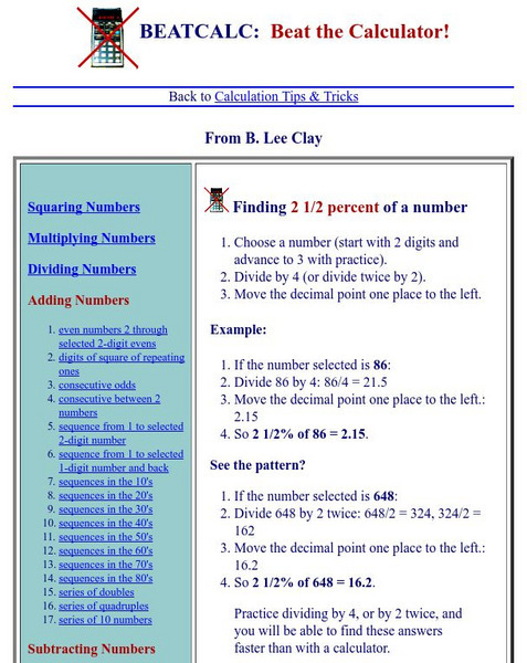 This site provides shortcuts and hints on how to do more complicated percentages without a calculator. For others beside 2.5, scroll down the left column and click percentage of choice under "Percents."