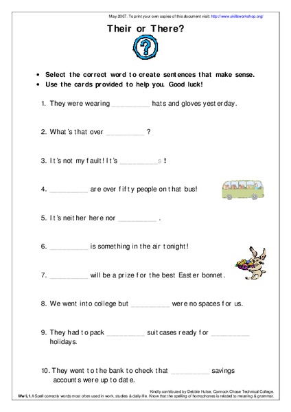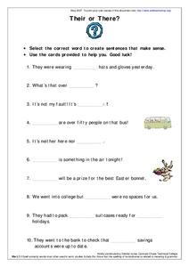 In this language arts activity, students learn when to use the words "there" and "their." Students complete 10 sentences with the correct word, either writing it in the blank or cutting and pasting word cards. The word "they're" is not mentioned.