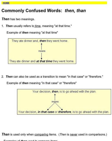 This entry explains the difference in meaning and usage of the words "then" and "than," gives examples of each, and provides a link to a page of practice exercises.