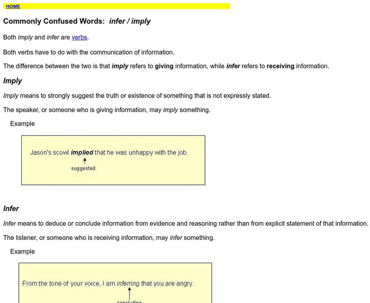 This entry focuses on the commonly confused words infer and imply including providing an explanation, examples, and a link to a quiz/exercise.