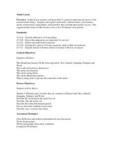 Students explore the five common turtles that are native to the eastern United States. They investigate each turtle's characteristics, environment, means of protection, eating habits, and show how they can help these turtles survive.
