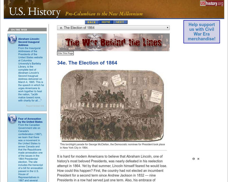 The route to victory for Abraham Lincoln was not assured during his campaign for reelection in 1864. Read about how the course of the war was affecting his popularity, and find out about the Democratic opposition to his policies. Find a map that shows the distribution of the electoral votes and the percentage of popular votes for the two candidates.