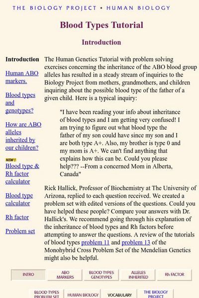 This site from the University of Arizona describes how blood type is passed on from parent to child. The tutorial covers the genetics of the ABO blood groups as well as Rh factor. There are even practice problems and blood type calculators!