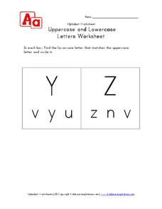 For this uppercase and lowercase letters worksheet, students find the lowercase letter that matches the uppercase letter and circle it. Students match the letters Y and Z.