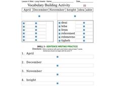 In this recognizing words with long vowel pronunciations, students write the words from dictation, unscramble their letters, and create sentences using the words April, December, November, height, idea, and able. Students complete eighteen activities.