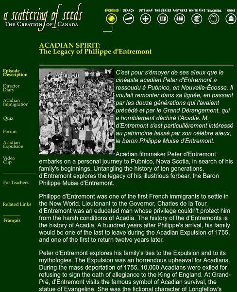 Baron Philippe Muise d'Entremont was an early Acadian immigrant to the New World. This site outlines the history of the d'Entremont family through the centuries and through historical events such as the expulsion of the Acadians in 1755. The making of a television documentary about the d'Entemonts is described.