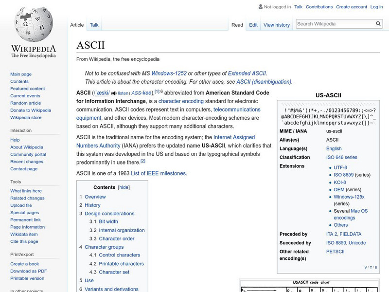 A thorough Wikipedia description of the computer character encoding scheme known as ASCII (American Standard Code for Information Interchange).