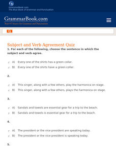 For this online interactive grammar worksheet, students answer 10 multiple choice questions regarding subject/verb agreement. Students may submit their answers to be scored.