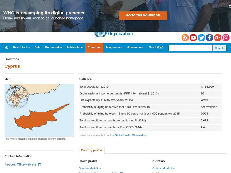 Learn about health in Cyprus via the World Health Organization's profile page on the country, which includes demographic information about core health indicators as well as general information.