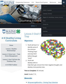 The "4-H Healthy Living Curriculum" is comprised of three lessons designed for tweens and teens. The first lesson looks at how social media may impact self-esteem and in turn how self-esteem impacts relationships. The second plan examines stress management and provides coping strategies. The final lesson focuses on thinking traps that distort how individuals perceive themselves and/or situations and teaches strategies that help learners get out of thinking traps.