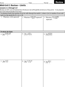 Flip your classroom and teach AP Calculus remotely! Unit 1 of the course focuses on limits and continuity. Informative videos introduce each lesson's topic, and the resource packets include worksheets, practice solutions, and two corrective assignments. In the first lesson, scholars learn about instantaneous rates of change by calculating average rates of change and then considering what would happen as the intervals become smaller and smaller. As the unit progresses, pupils learn the definition of limits and see how to determine a limit given a graph of a relation, learn the notation for one-sided limits and how to determine the value of a one-sided limit from graphs, how to find the limit of a function from a table of values, how to determine limits using algebraic properties, and how to use algebraic manipulation to determine limits. Other lessons teach pupils ways to algebraically determine the limit of a function at a specified value, connect multiple representations of limits, confirm continuity over an interval, and remove the discontinuity from rational functions. The Squeeze Theorem, infinite limits, and vertical asymptotes of rational functions are the topics of other lessons. The last lesson in the unit asks scholars to apply the Intermediate Value Theorem to a table of values to answer questions about the continuous function the table represents. Unit 1 ends with an end-of-unit review in which Individuals identify and classify discontinuities, investigate continuity at a point, evaluate limits at infinity, and determine horizontal asymptotes.