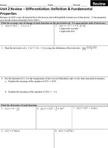The eleven lessons in Unit 2 of the flipped math calculus course take up the definition and fundamental differentiation properties. Lessons include teaching scholars how to use their knowledge of the formula to find the average rate of change to find the instantaneous rate of change and find the derivative of a function by applying the definition using limits. Pupils also learn to estimate the derivative of a function at a point by using the derivative functionality of their graphing calculators and how differentiability and continuity relate to each other. In other lessons, participants learn the power rule that allows for a shortcut to take the derivative of terms to power, more rules to use as shortcuts to find derivatives, and how to use the rules to find the equations of the tangent line and the normal line at a given point. Derivatives of the two basic trigonometric functions, cosine, and sine, the product rule of finding the derivative of two functions' product. Using the quotient rule to determine the derivative of two quotients is the focus of subsequent lessons. Finally, pupils see the derivatives of the other four trigonometric functions and begin to memorize the rules. The unit-ending review asks pupils to work through 20 problems to demonstrate what they have learned about differentiation.