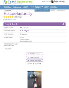 Young engineers design laparoscopic surgical tools in an 11-lesson unit aligned with the Next Generation Science Standards. The first lesson introduces the class to the abdominopelvic cavity. Teams learn what it is like to perform laparoscopic surgery while completing three different tasks and quantify their performance. Next, groups investigate elasticity with a set of springs. They collect data to calculate the spring constant for each spring using Hooke's Law. Another lesson helps learners connect Hooke's law and elasticity with an activity that introduces the class to the behavior of elastic materials. The resource defines stress and strain to calculate the modulus of materials' elasticity and introduces the class to an engineering stress-strain graph. To understand the similarities and differences between elasticity and viscosity, class members investigate four types of fluid behaviors: shear thinning, shear thickening, Bringham plastic, and Newtonian. They then measure the time it takes a marble to fall a specified distance in household fluids. Using unit conversions and algebra, the teams then determine the viscosity of the fluids. Next, future engineers learn about viscoelastic materials and how they differ from solids and fluids. They discover how the molecular structures of the materials relate to their properties, including strain rate dependence, stress relaxation, creep, hysteresis, and preconditioning. It might be silly to determine the creep rate of putty but groups will enjoy making different formulations of silly putty and playing with them to understand how the different mixtures behave. The second part of the activity has groups calculate and compare the creep rate between the silly putty. Pupils learn more about tissue mechanics by reflecting on how silly putty and human tissues are alike. The lesson covers collagen, elastin, and proteoglycans and their effects on body tissues. Moving on, groups explore preconditioning by stretching a balloon to the point of equilibrium. They then measure the force required to stretch the balloon to the same point several times. By graphing the data, they recognize when the force no longer increases. The engineering design process meets laparoscopic surgical robots with an activity that is the last part of the series of 10 and brings all the unit's lessons together. Teams design and build a remotely controlled laparoscopic device. The goal of the device is to search for disease, obtain biopsies, and monitor the process via wireless imaging.
