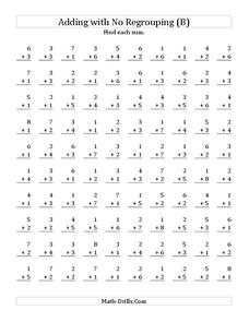 In this addition worksheet, students find the sums by adding one-digit numbers without regrouping. Students solve 64 problems.