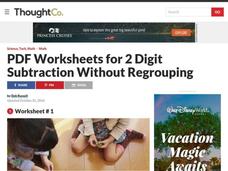 No regrouping required. Hone basic subtraction skills with 20 problems. Learners subtract double-digit numbers.