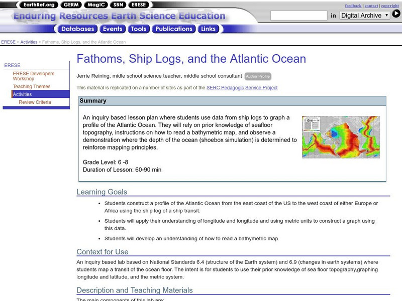 Students use data from ship logs to graph a profile of the Atlantic Ocean. They will rely on prior knowledge of seafloor topography, instructions on how to read a bathymetric map, and observe a demonstration where the depth of the ocean...