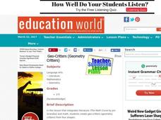 Learners read the book The Math Curse by Jon Scieszka and study geometry. In this geometry activity, students identify geometric shapes and their properties. Learners create a geo-critter.