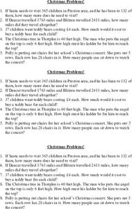 Here's a little holiday-oriented math review/challenge. Three-up on a single sheet for copying, each set consists of five problems that range from three- and four-digit subtraction to multiplication and division to four and five. Typo...
