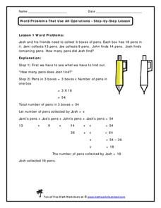 Can your learners figure out which equation to solve? Use this resource to challenge your third graders with word problems involving the four operations. Each problem has a section to write the answer, but pupils will need to write out...