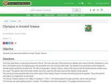 Students examine how athletes from various ancient Greek city-states behaved at the Olympic Games. They conduct Internet research, take notes on a worksheet, and write a screenplay for a television drama about the Olympic Games in...