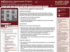 Interpreting algebraic expressions is a fundamental skill in beginning algebra. This lesson approaches the task in numerous ways. First, learners assess their understanding with a short worksheet on converting between words and...