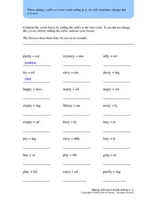 In this suffixes practice worksheet, students combine 24 root words that end in y to suffixes. Students determine whether they need to change the y endings to i as they add the suffixes.