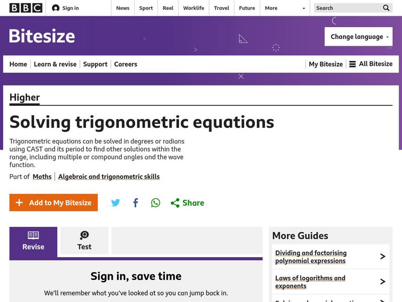 BBC provides a tutorial that explains how radians are related to degrees and demonstrates how to solve trig equations in radian units. Examples and a practice test are available.