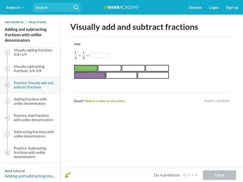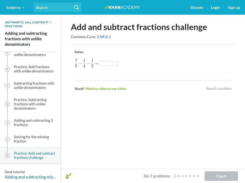 Challenge problems involving adding and subtracting fractions that have unlike denominators. Students receive immediate feedback and have the opportunity to try questions repeatedly, watch a video or receive hints.