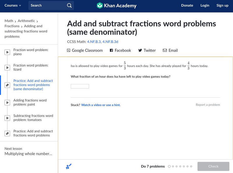 Khan Academy: Add and Subtract Fractions Word Problems (Same Denominator)
