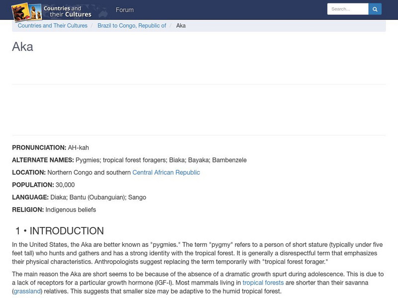 Provides an overview of the traditional culture and lifestyle of the Aka people of the Congo and the Central African Republic. Gives basic facts about location, language, folklore, foods, social customs, family life, education, religion,...