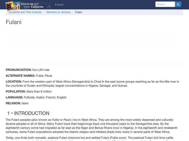 Provides an overview of the traditional culture and lifestyle of the Fulani, an African people. Gives basic facts about location, language, folklore, foods, social customs, family life, education, religion, pastimes, societal challenges,...