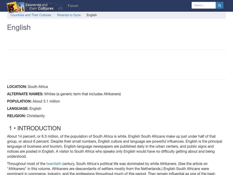 Provides an overview of the traditional culture and lifestyle of the English in South Africa. Gives basic facts about location, language, folklore, foods, social customs, family life, education, religion, pastimes, societal challenges,...