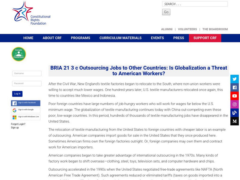 Lesson in economics and democracy in which students analyze the decision to outsource jobs and determine if globalization is a threat to American workers. Small group, independent and whole class work. Links to related material.