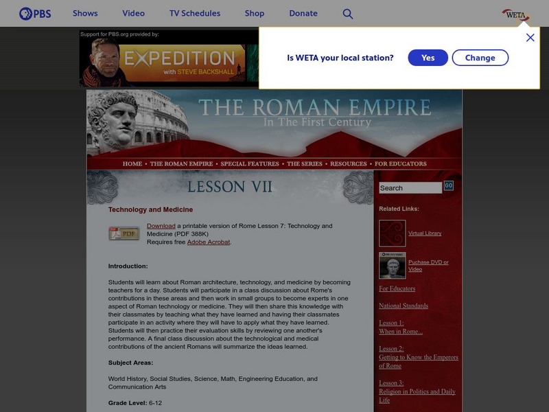 Students will learn about Roman architecture, technology, and medicine by becoming teachers for a day. Students will participate in a class discussion about Rome's contributions in these areas and then work in small groups to become...