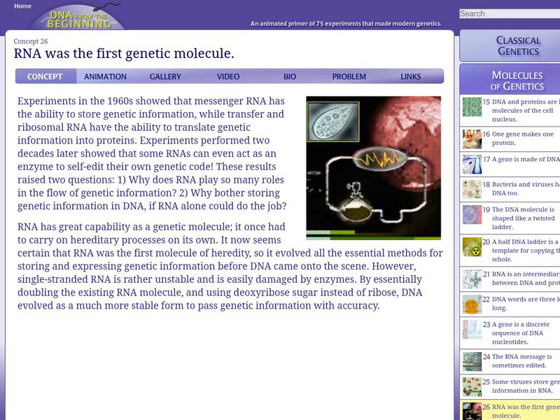 RNA is now considered to be the first molecule that could transmit information. This article looks at the scientists and experiments that developed this idea. Article includes animations, pictures, video, biographical information, and...