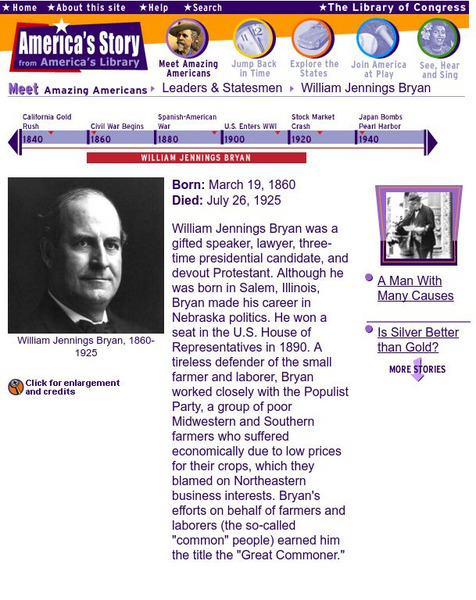 Here is a short biography on William Jennings Bryan, American politician of the Populist Party. Additional information can be found through the articles at the bottom of the page regarding Bryan's causes, his principles, and the Free...