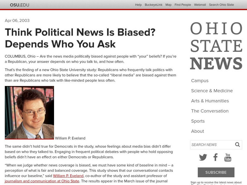 Article about Ohio State University study that explores whether Republicans or Democrats think political news is biased. (Published April 7, 2003)