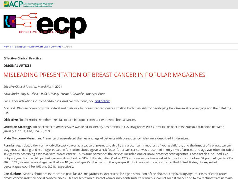 An article from "Effective Clinical Practice," a past publication of the American College of Physicians, details the biased presentation of breast cancer danger and how it affects public perception. [Published March/April 2001]
