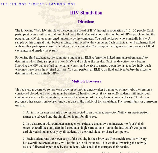 Provides a web lab which simulates the potential spread of HIV. May be used with whole class instruction, cooperative learning groups or individual instruction.