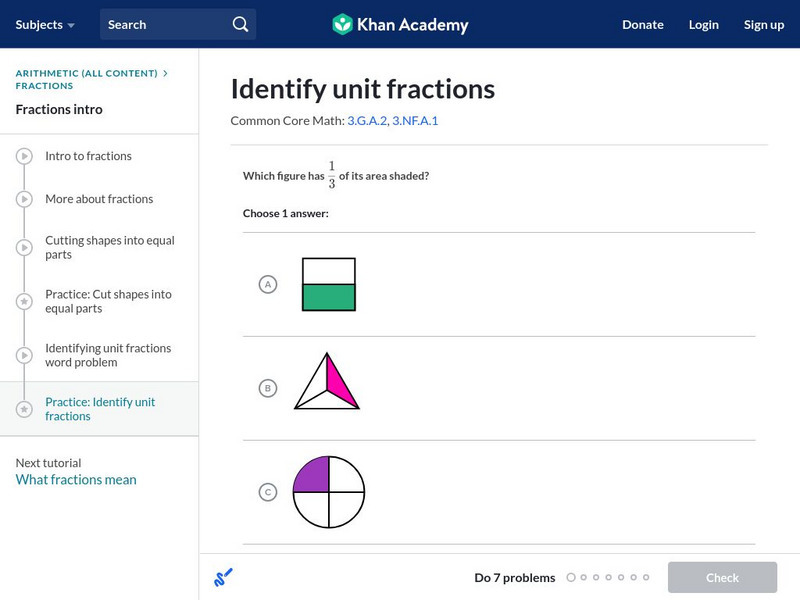 Identify unit fractions when given a visual or a context. Students receive immediate feedback and have the opportunity to try questions repeatedly, watch a video tutorial, receive hints. CCSS.Math.Content.3.G.A.2 Partition shapes into...