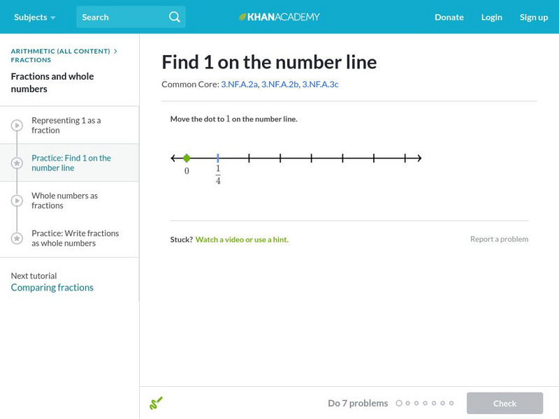 Locate 1 on a number line labeled with 0 and a unit fraction. Students receive immediate feedback and have the opportunity to try questions repeatedly, watch a video or receive hints. CCSS.Math.Content.3.NF.A.1 Standard 2. Understand a...