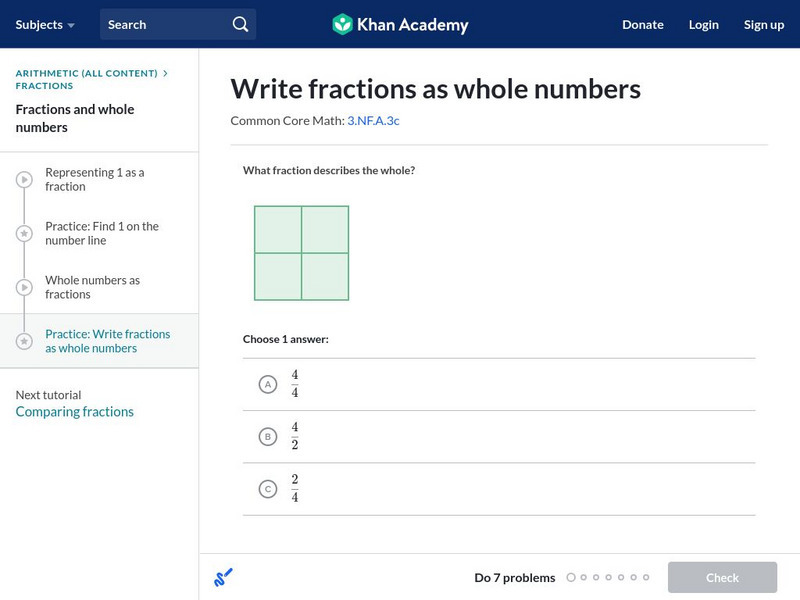 Represent fractions as whole numbers and whole numbers as fractions. Students receive immediate feedback and have the opportunity to try questions repeatedly, watch a video or receive hints.CCSS.Math.Content.3.NF.A.3.c Express whole...
