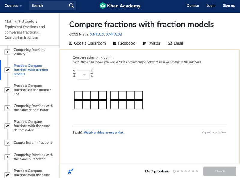 Practice comparing fractions with the help of visuals aides. Students receive immediate feedback and have the opportunity to try questions repeatedly, watch a video or receive hints. CCSS.Math.Content.3.NF.A.2.b Represent a fraction a/b...