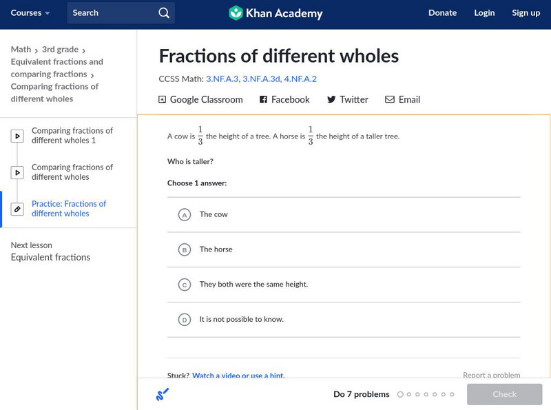 Compare two fractions based on the whole that each one refers to. Students receive immediate feedback and have the opportunity to try questions repeatedly, watch a video or receive hints. CCSS.Math.Content.3.NF.A.2.b Represent a fraction...
